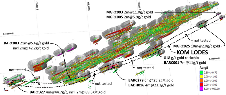Samaradougou: Over 1 km of closely spaced drilling with well-defined gold mineralization, open along strike.