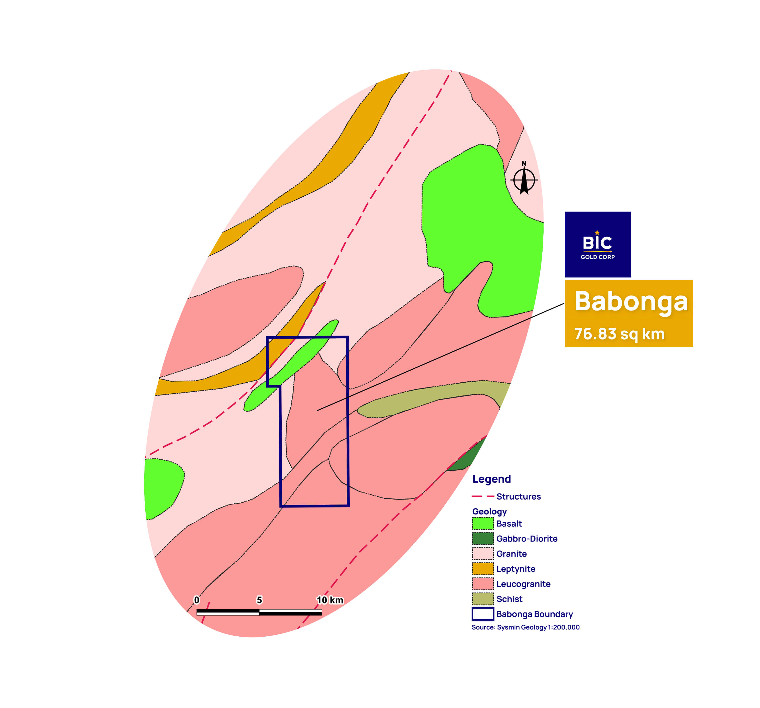 The Babonga Project is regionally characterized by four major lithological units. In the northwestern corner, there is the presence of leptynite, along with a parallel zone of basalt reported in the same area. The rest of the project area is dominated by granitic rocks, including both leucogranite and granite.