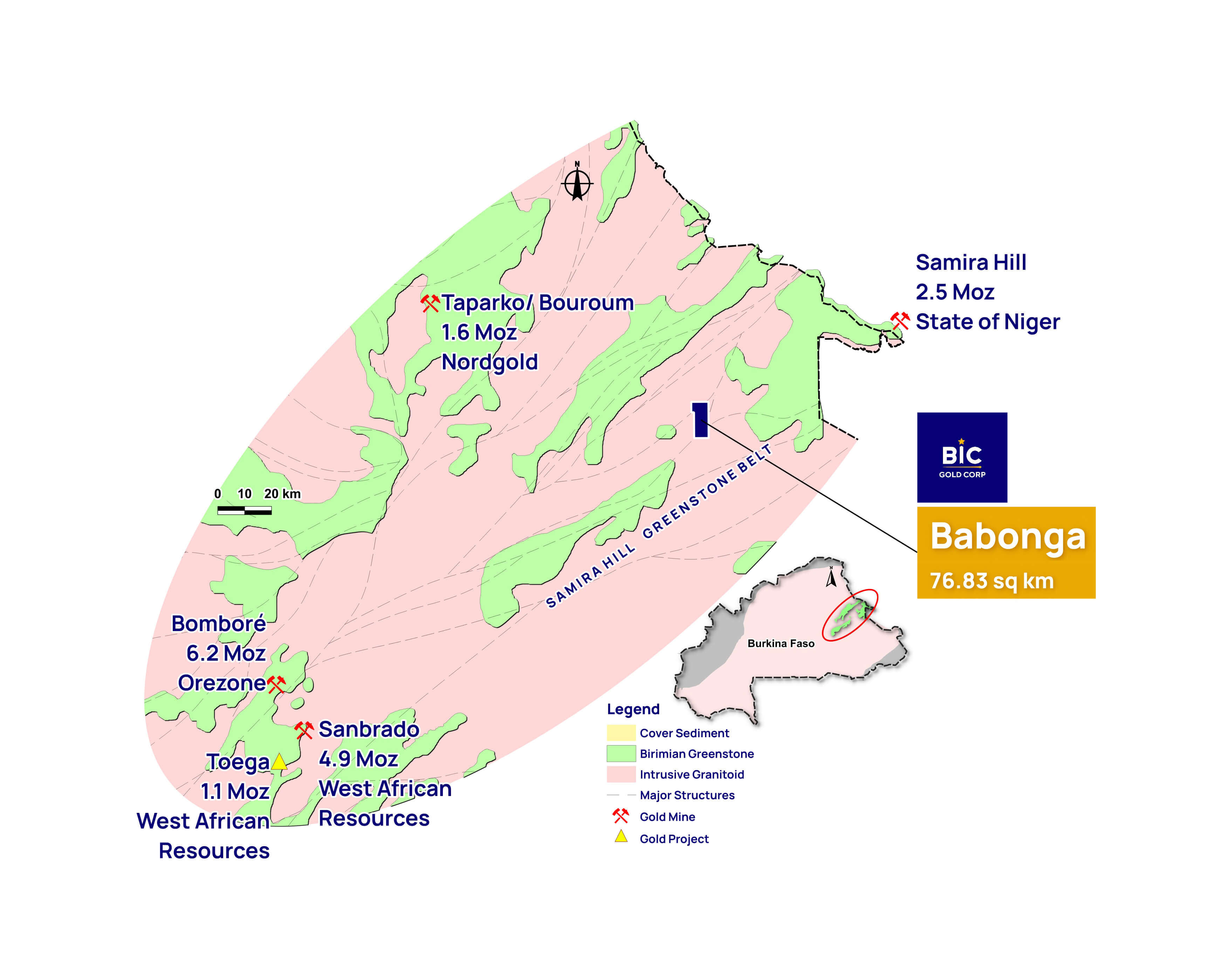 The Babonga Project is located in north-eastern Burkina Faso, approximately 364 km northeast of the capital city, Ouagadougou. BIC has recently acquired Golden Rim Resources SARL, the company that holds the Babonga Project.